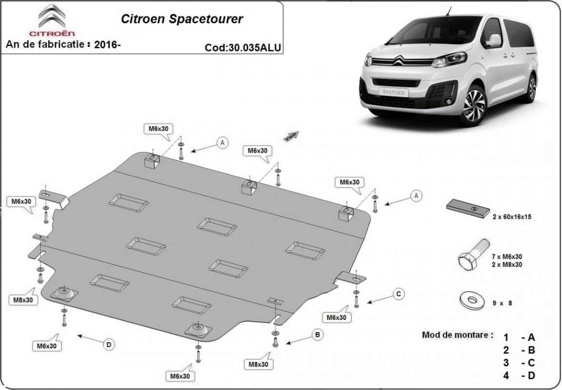 Skid plate for the protection of the: engine, gearbox, radiator The skid plate is new and fits perfectly for all versions of Citroen Spacetourer manufactured between 2016 and 2026. Made out of 3 mm thick Aluminium plate. The shields are made of aluminum, but the mounting brackets are made of steel. Screws, nuts, clips, all fastening accessories are included. All skid plates are powder coated to prevent corrosion. The exterior of the skid plate is provided with Aluminium reinforcements, which increases the resistance to impact. |