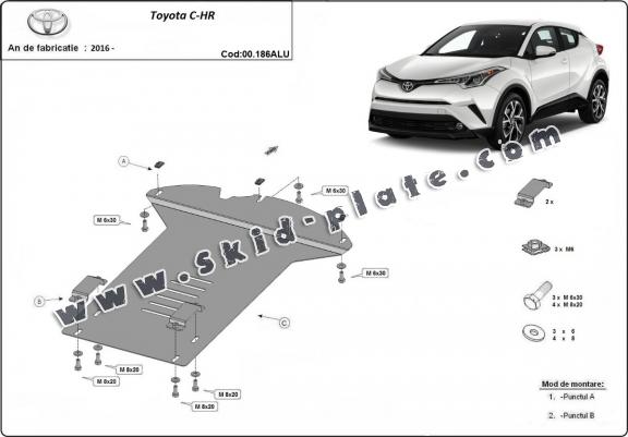 Skid plate for the protection of the: Catalytic converter The skid plate is new and fits perfectly for all versions of Toyota C-HR manufactured between 2016 and 2023. Made out of 3 mm thick Aluminium plate. The shields are made of aluminum, but the mounting brackets are made of steel. Screws, nuts, clips, all fastening accessories are included. All skid plates are powder coated to prevent corrosion. The exterior of the skid plate is provided with Aluminium reinforcements, which increases the resistance to impact. |