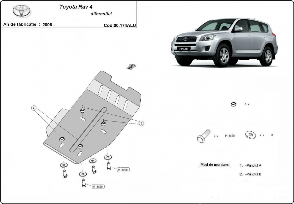 Skid plate for the protection of the: rear differential The skid plate is new and fits perfectly for all versions of Toyota Rav4 manufactured between 2006 and 2013. Made out of 3 mm thick Aluminium plate. The shields are made of aluminum, but the mounting brackets are made of steel. Screws, nuts, clips, all fastening accessories are included. All skid plates are powder coated to prevent corrosion. The exterior of the skid plate is provided with Aluminium reinforcements, which increases the resistance to impact. |
