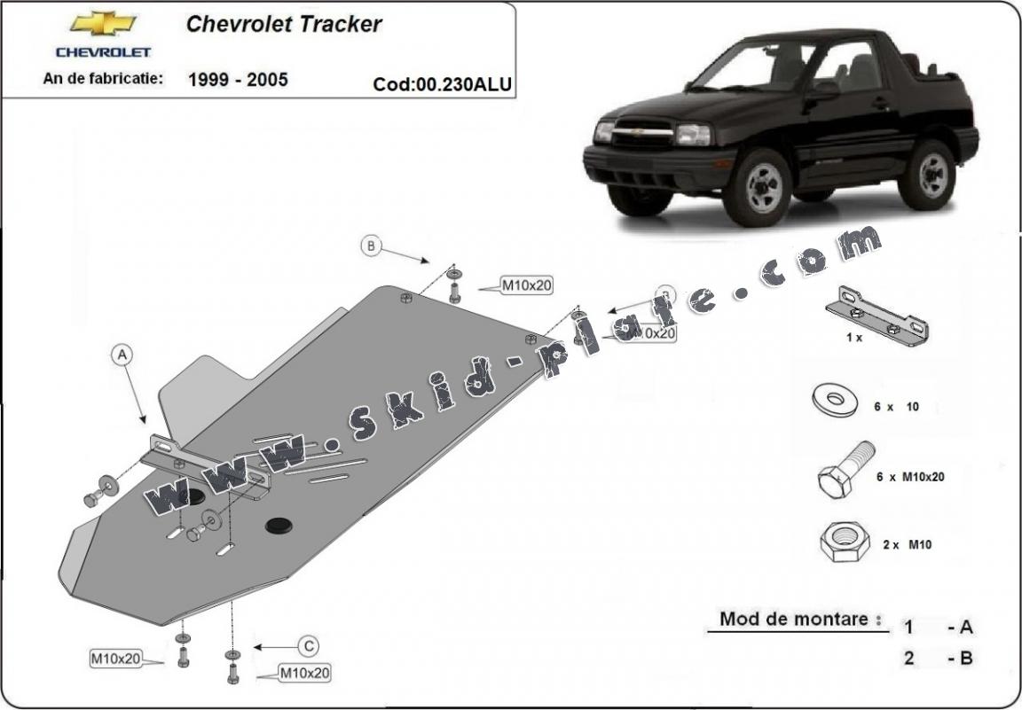 Skid plate for the protection of the: gearbox The skid plate is new and fits perfectly for all versions of Chevrolet Tracker manufactured between 1999 and 2005. Made out of 3 mm thick Aluminium plate. The shields are made of aluminum, but the mounting brackets are made of steel. Screws, nuts, clips, all fastening accessories are included. All skid plates are powder coated to prevent corrosion. The exterior of the skid plate is provided with Aluminium reinforcements, which increases the resistance to impact. |