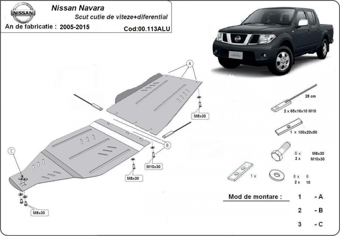 Skid plate for the protection of the: gearbox, Transfer case The skid plate is new and fits perfectly for all versions of Nissan Navara manufactured between 2005 and 2015. Made out of 4 mm thick Aluminium plate. The shields are made of aluminum, but the mounting brackets are made of steel. Screws, nuts, clips, all fastening accessories are included. All skid plates are powder coated to prevent corrosion. The exterior of the skid plate is provided with Aluminium reinforcements, which increases the resistance to impact. |