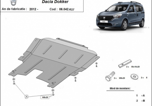 Skid plate for the protection of the: engine, gearbox The skid plate is new and fits perfectly for all versions of Dacia Dokker manufactured between 2012 and 2020. Made out of 4 mm thick Aluminium plate. The shields are made of aluminum, but the mounting brackets are made of steel. Screws, nuts, clips, all fastening accessories are included. All skid plates are powder coated to prevent corrosion. The exterior of the skid plate is provided with Aluminium reinforcements, which increases the resistance to impact. |