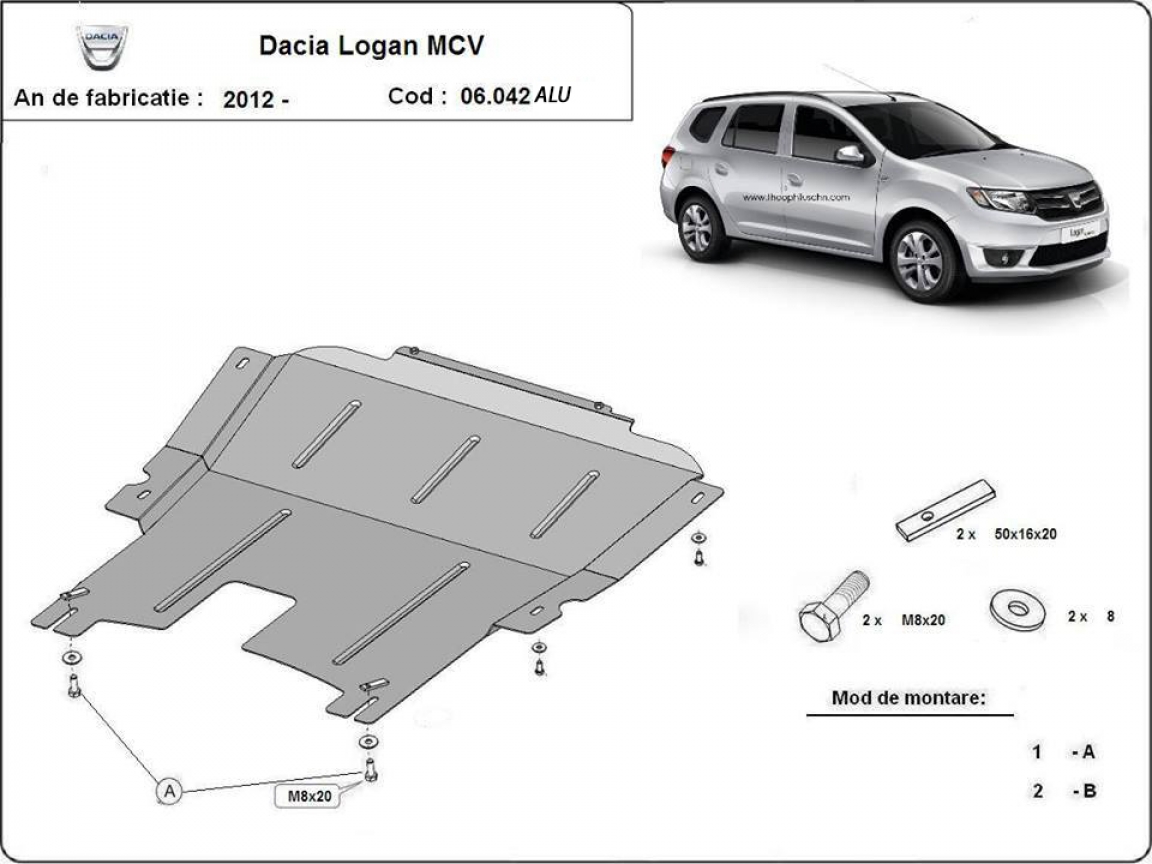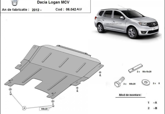 Skid plate for the protection of the: engine, gearbox The skid plate is new and fits perfectly for all versions of DACIA LOGAN MCV manufactured between 2012 and 2020. Made out of 4 mm thick Aluminium plate. The shields are made of aluminum, but the mounting brackets are made of steel. Screws, nuts, clips, all fastening accessories are included. All skid plates are powder coated to prevent corrosion. The exterior of the skid plate is provided with Aluminium reinforcements, which increases the resistance to impact. |