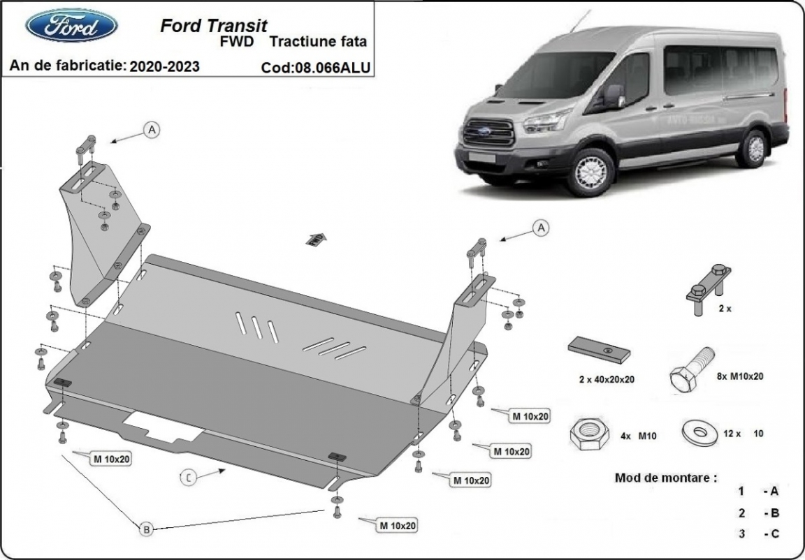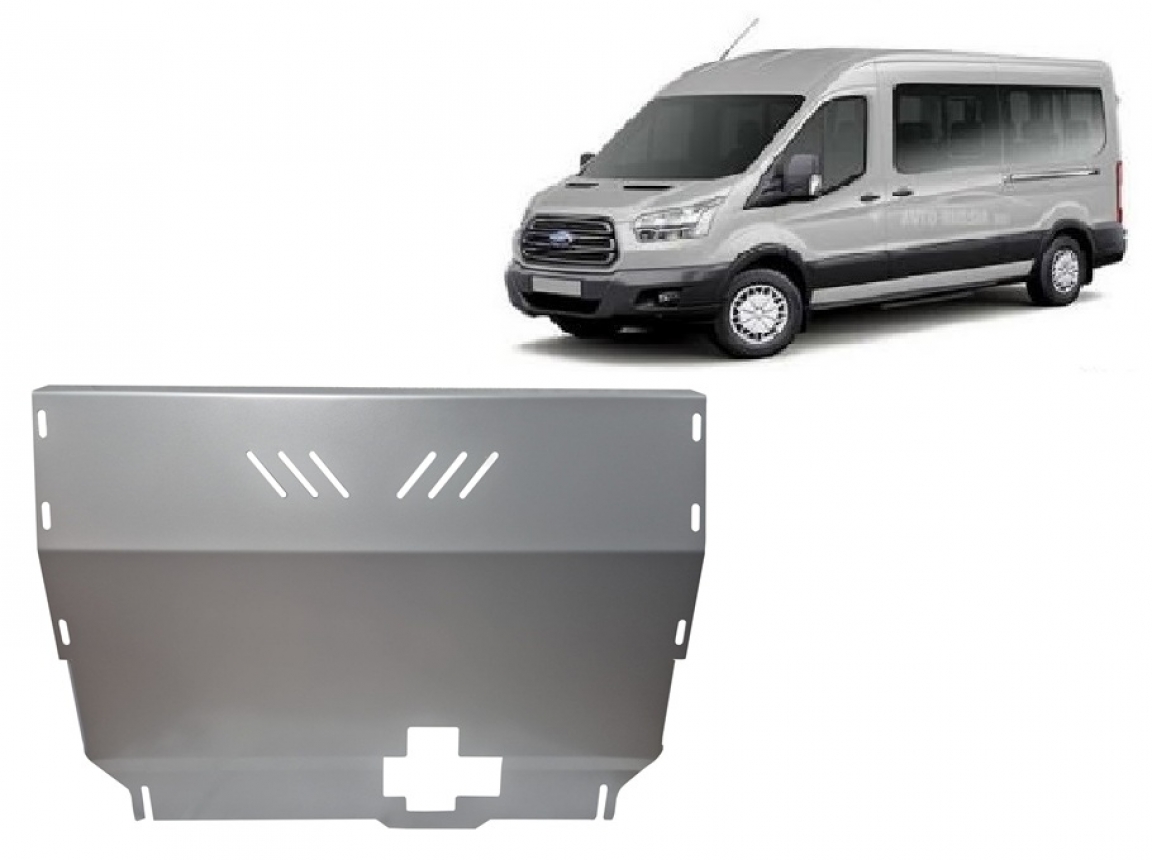 Skid plate for the protection of the: engine, gearbox, radiator, front bumper The skid plate is new and fits perfectly for all versions of Ford Transit manufactured between 2020 and 2026. Made out of 3 mm thick Aluminium plate. The shields are made of aluminum, but the mounting brackets are made of steel. Screws, nuts, clips, all fastening accessories are included. All skid plates are powder coated to prevent corrosion. The exterior of the skid plate is provided with Aluminium reinforcements, which increases the resistance to impact. |