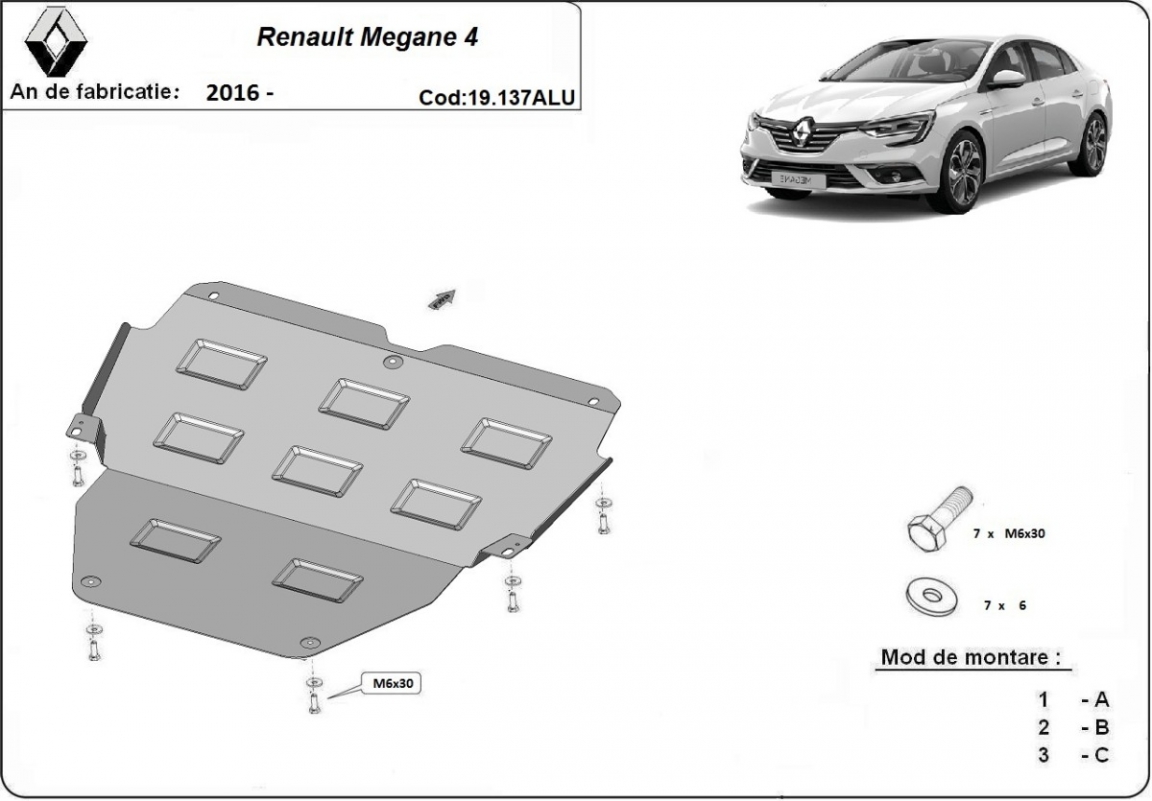 Skid plate for the protection of the: engine, gearbox The skid plate is new and fits perfectly for all versions of Renault Megane IV manufactured between 2016 and 2026. Made out of 3 mm thick Aluminium plate. The shields are made of aluminum, but the mounting brackets are made of steel. Screws, nuts, clips, all fastening accessories are included. All skid plates are powder coated to prevent corrosion. The exterior of the skid plate is provided with Aluminium reinforcements, which increases the resistance to impact. |