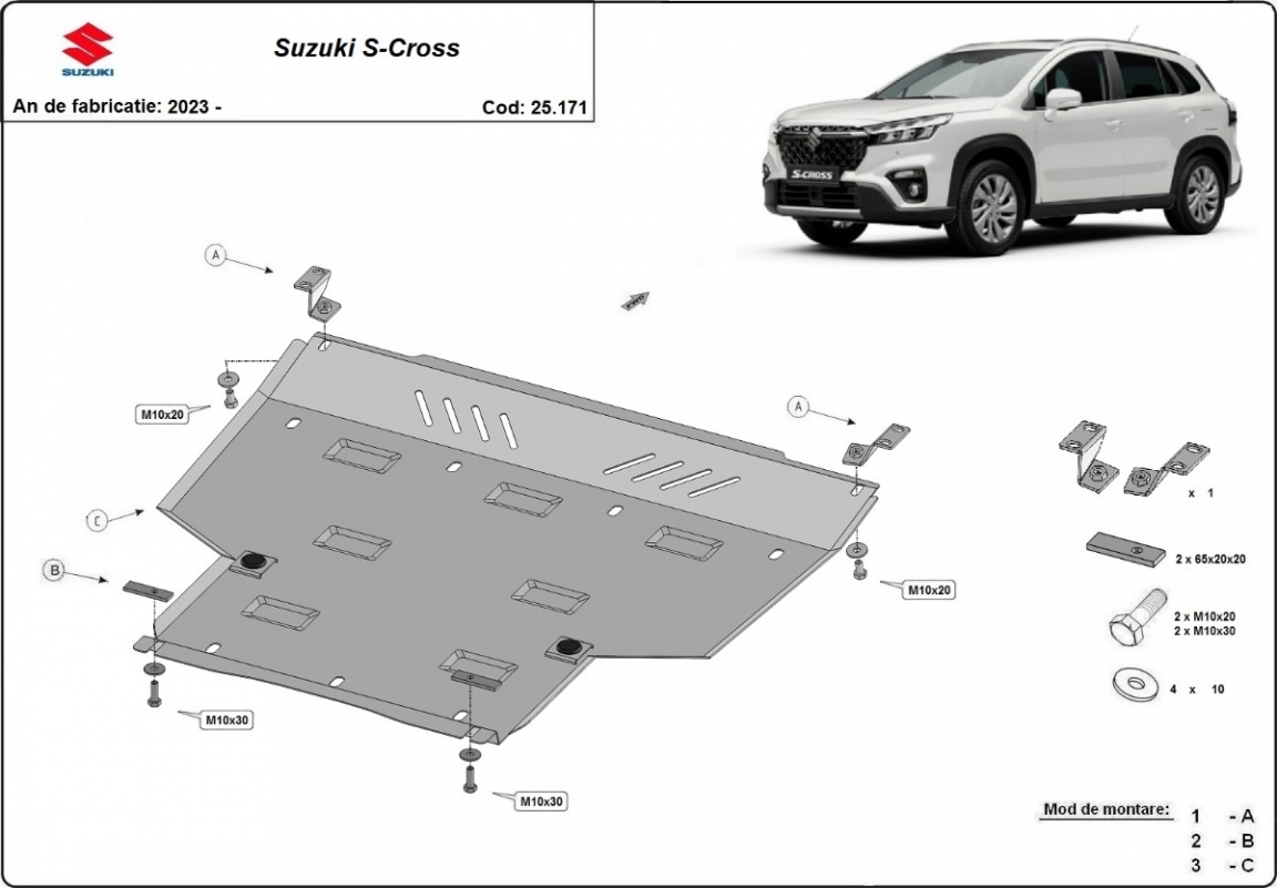 Skid plate for the protection of the: engine, gearbox The skid plate is new and fits perfectly for the Suzuki S-Cross, with the following engine/drive versions: Hybrid - manufactured between 2023 and 2026. Made out of 4 mm thick Aluminium plate. The shields are made of aluminum, but the mounting brackets are made of steel. Screws, nuts, clips, all fastening accessories are included. All skid plates are powder coated to prevent corrosion. The exterior of the skid plate is provided with Aluminium reinforcements, which increases the resistance to impact. |