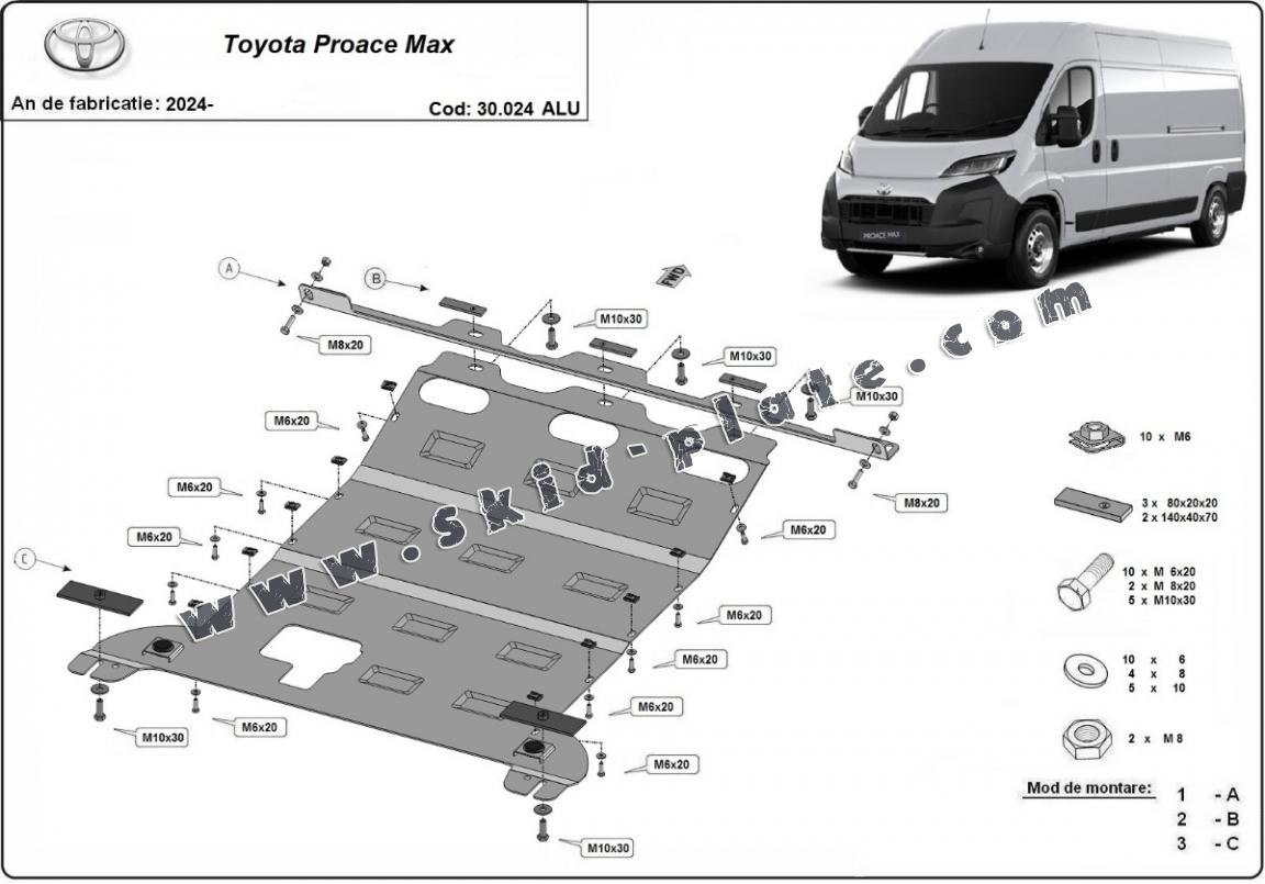Skid plate for the protection of the: engine, gearbox, radiator The skid plate is new and fits perfectly for all versions of Toyota Proace Max manufactured between 2024 and 2026. Made out of 4 mm thick Aluminium plate. The shields are made of aluminum, but the mounting brackets are made of steel. Screws, nuts, clips, all fastening accessories are included. All skid plates are powder coated to prevent corrosion. The exterior of the skid plate is provided with Aluminium reinforcements, which increases the resistance to impact. |