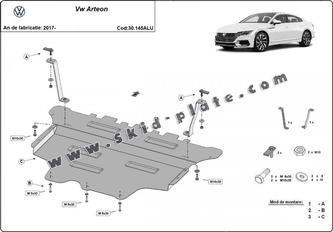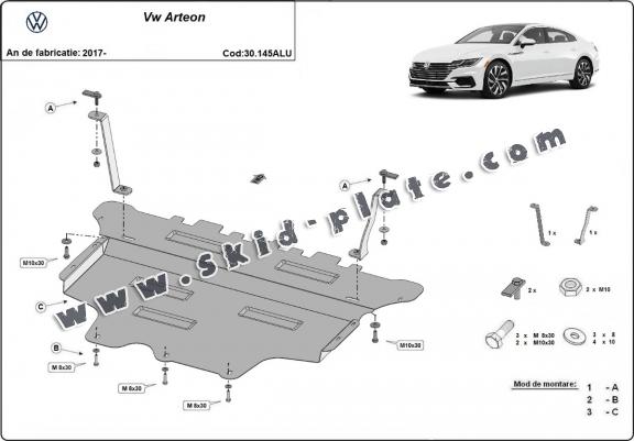 Skid plate for the protection of the: engine, gearbox, radiator, front bumper The skid plate is new and fits perfectly for all versions of VW Arteon manufactured between 2017 and 2026. Made out of 3 mm thick Aluminium plate. The shields are made of aluminum, but the mounting brackets are made of steel. Screws, nuts, clips, all fastening accessories are included. All skid plates are powder coated to prevent corrosion. The exterior of the skid plate is provided with Aluminium reinforcements, which increases the resistance to impact. |