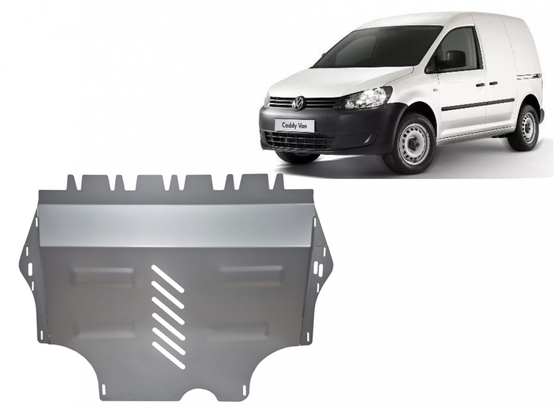 Skid plate for the protection of the: engine, gearbox, radiator The skid plate is new and fits perfectly for all versions of VW Caddy manufactured between 2011 and 2020. Made out of 3 mm thick Aluminium plate. The shields are made of aluminum, but the mounting brackets are made of steel. Screws, nuts, clips, all fastening accessories are included. All skid plates are powder coated to prevent corrosion. The exterior of the skid plate is provided with Aluminium reinforcements, which increases the resistance to impact. |