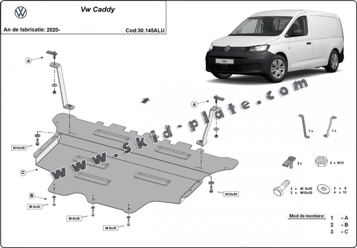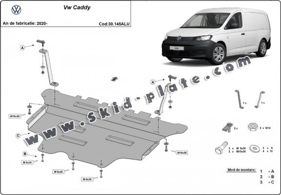 Skid plate for the protection of the: engine, gearbox, radiator, front bumper The skid plate is new and fits perfectly for all versions of VW Caddy manufactured between 2020 and 2026. Made out of 3 mm thick Aluminium plate. The shields are made of aluminum, but the mounting brackets are made of steel. Screws, nuts, clips, all fastening accessories are included. All skid plates are powder coated to prevent corrosion. The exterior of the skid plate is provided with Aluminium reinforcements, which increases the resistance to impact. |