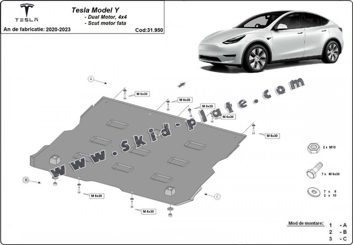 Skid plate for the protection of the: front electric motor The skid plate is new and fits perfectly for the Tesla Model Y AWD, with the following engine/drive versions: Dual Motor - manufactured between 2020 and 2023. Made out of 2 mm thick Steel plate. Screws, nuts, clips, all fastening accessories are included. All skid plates are powder coated to prevent corrosion. The exterior of the skid plate is provided with Steel reinforcements, which increases the resistance to impact. |