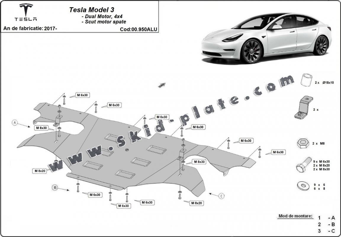 Skid plate for the protection of the: rear electric motor The skid plate is new and fits perfectly for all versions of Tesla Model 3 AWD manufactured between 2017 and 2026. Made out of 3 mm thick Aluminium plate. The shields are made of aluminum, but the mounting brackets are made of steel. Screws, nuts, clips, all fastening accessories are included. All skid plates are powder coated to prevent corrosion. The exterior of the skid plate is provided with Aluminium reinforcements, which increases the resistance to impact. |