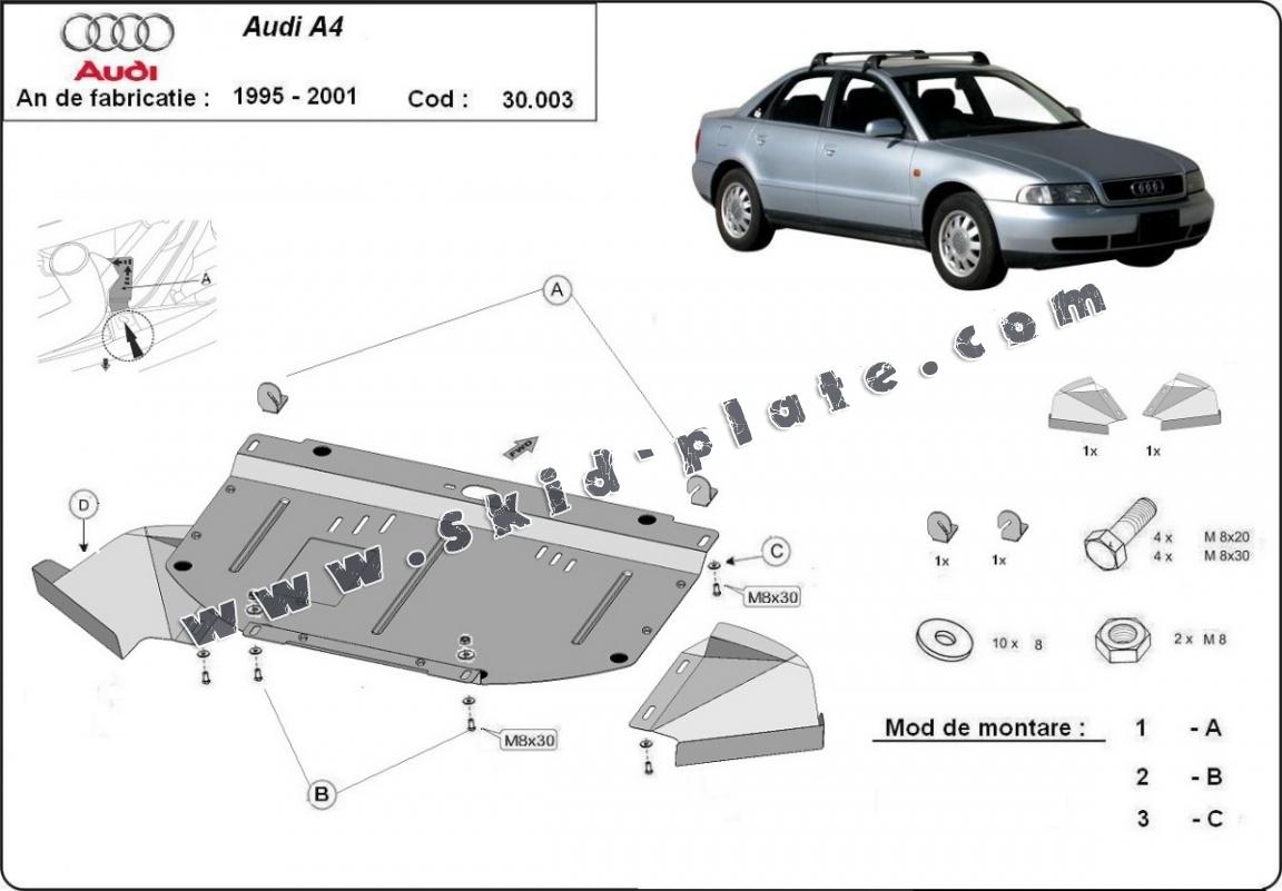 The skid plate is new and fits perfectly for the Audi A4 B5, with the following engine/drive versions: 1.6- 2.0, 1.9TDI - manufactured between 1995 and 2000.