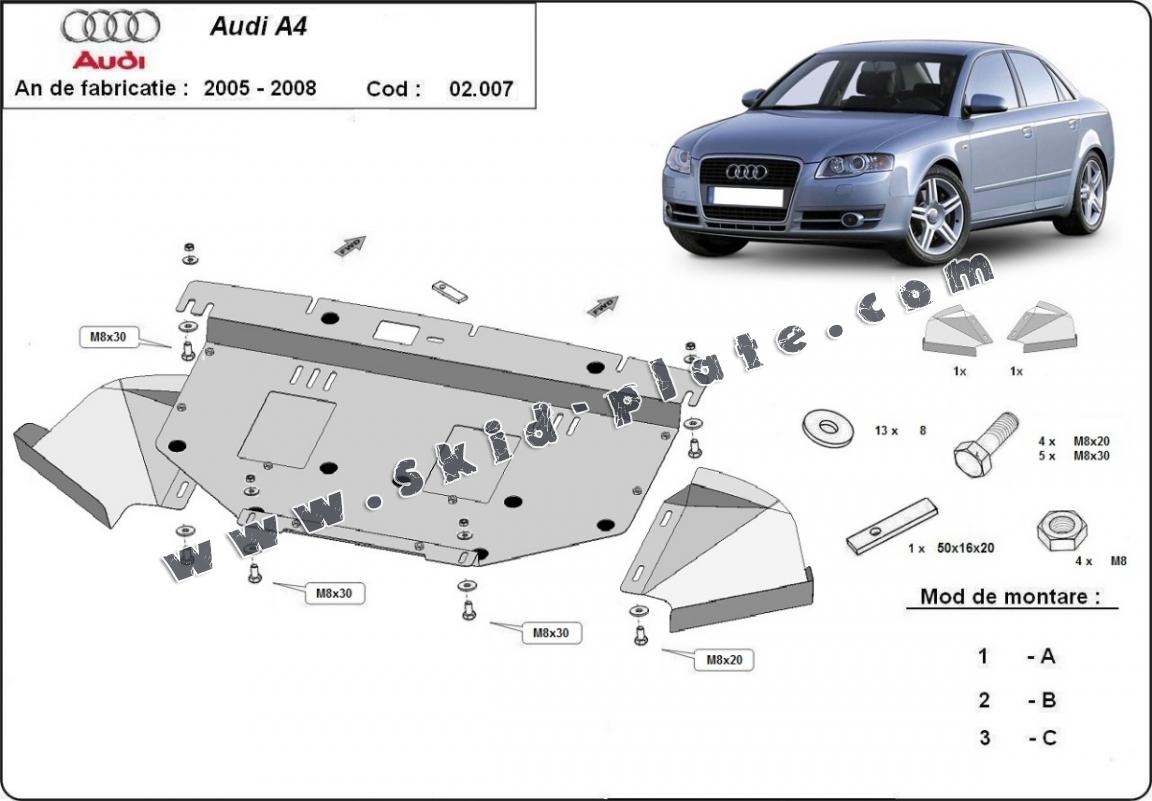 The skid plate is new and fits perfectly for the Audi A4 B7, with the following engine/drive versions: 1.6 , 1.8 , 2.0 , 1.9 tdi , 2.0 tdi , 3.0 tdi 3.2 TFSI - manufactured between 2005 and 2008.