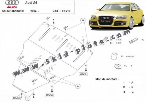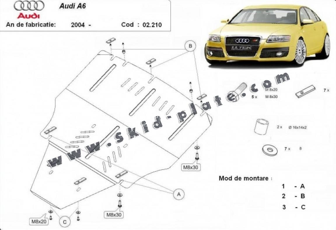 Skid plate for the protection of the: engine, gearbox, radiator, front bumper The skid plate is new and fits perfectly for the Audi A6, with the following engine/drive versions: Fara laterale - manufactured between 2004 and 2011. Made out of 2 mm thick Steel plate. Screws, nuts, clips, all fastening accessories are included. All skid plates are powder coated to prevent corrosion. The exterior of the skid plate is provided with Steel reinforcements, which increases the resistance to impact. |