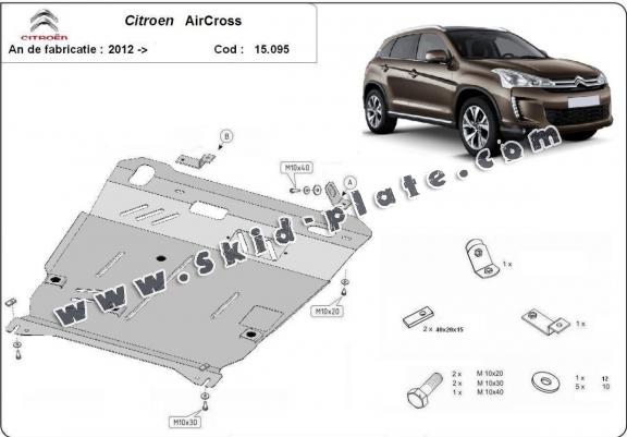 Skid plate for the protection of the: engine, gearbox, radiator The skid plate is new and fits perfectly for all versions of Citroen Aircross manufactured between 2012 and 2017. It has an opening for the oil sump, so it's removal won't be necessary to change the oil. Made out of 2.5 mm thick Steel plate. Screws, nuts, clips, all fastening accessories are included. All skid plates are powder coated to prevent corrosion. The exterior of the skid plate is provided with Steel reinforcements, which increases the resistance to impact. |