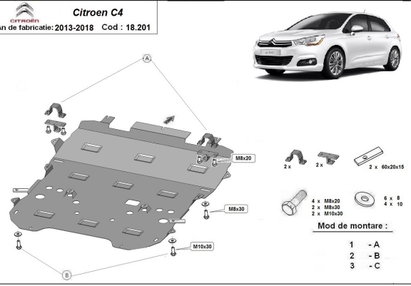 Skid plate for the protection of the: engine, gearbox, radiator, front bumper The skid plate is new and fits perfectly for all versions of Citroen c4 manufactured between 2013 and 2018. Made out of 2 mm thick Steel plate. Screws, nuts, clips, all fastening accessories are included. All skid plates are powder coated to prevent corrosion. The exterior of the skid plate is provided with Steel reinforcements, which increases the resistance to impact. |