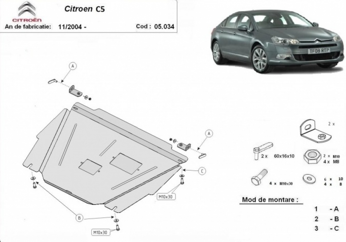 The skid plate is new and fits perfectly for all versions of Citroen C5 manufactured between 2004 and 2007.