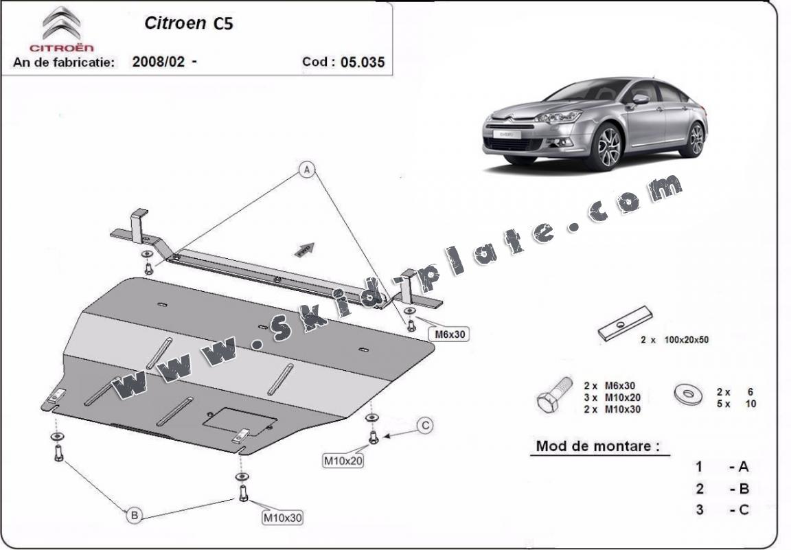 Skid plate for the protection of the: engine, gearbox The skid plate is new and fits perfectly for the citroen C5, with the following engine/drive versions: 1.6, 1.8, 2.0, HDI - manufactured between 2008 and 2017. Made out of 2 mm thick Steel plate. Screws, nuts, clips, all fastening accessories are included. All skid plates are powder coated to prevent corrosion. The exterior of the skid plate is provided with Steel reinforcements, which increases the resistance to impact. |