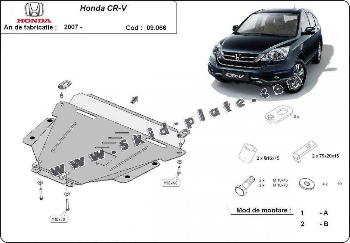 Skid plate for the protection of the: engine, gearbox, radiator The skid plate is new and fits perfectly for all versions of Honda CR-V manufactured between 2007 and 2012. It has an opening for the oil sump, so it's removal won't be necessary to change the oil. Made out of 2,5 mm thick Steel plate. Screws, nuts, clips, all fastening accessories are included. All skid plates are powder coated to prevent corrosion. The exterior of the skid plate is provided with Steel reinforcements, which increases the resistance to impact. |