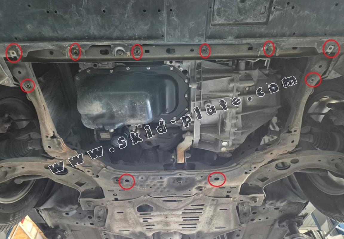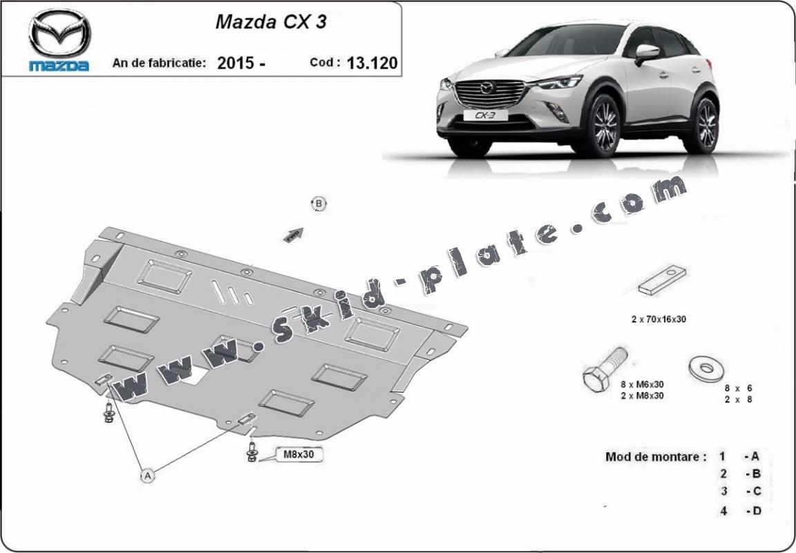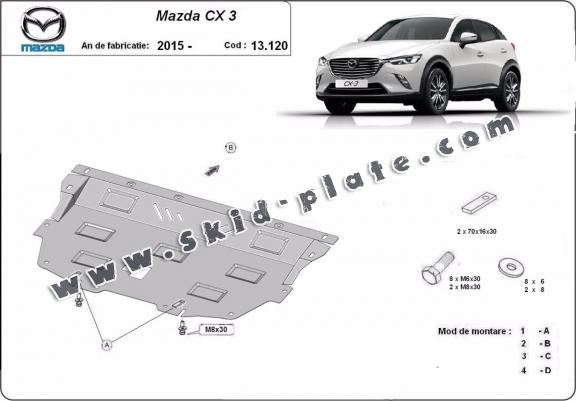 Skid plate for the protection of the: engine, gearbox The skid plate is new and fits perfectly for all versions of Mazda CX3 manufactured between 2015 and 2026. Made out of 2 mm thick Steel plate. Screws, nuts, clips, all fastening accessories are included. All skid plates are powder coated to prevent corrosion. The exterior of the skid plate is provided with Steel reinforcements, which increases the resistance to impact. |