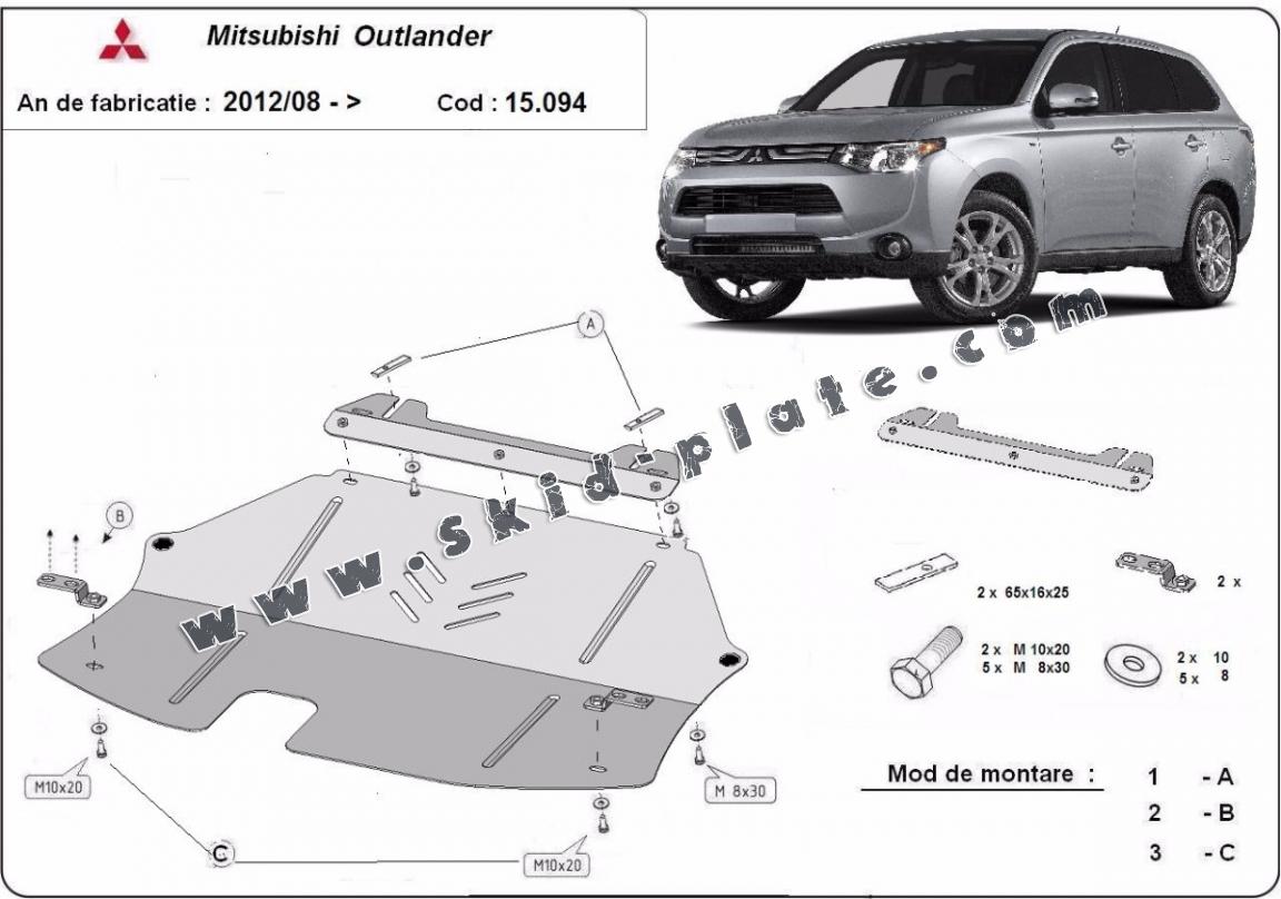 Skid plate for the protection of the: engine, gearbox The skid plate is new and fits perfectly for all versions of Mitsubishi Outlander manufactured between 2012 and 2021. Made out of 2,5 mm thick Steel plate. Screws, nuts, clips, all fastening accessories are included. All skid plates are powder coated to prevent corrosion. The exterior of the skid plate is provided with Steel reinforcements, which increases the resistance to impact. |