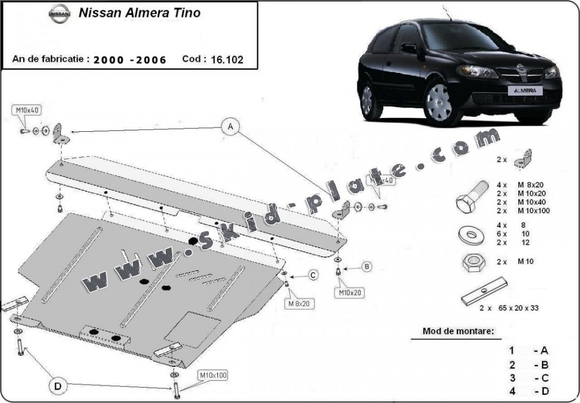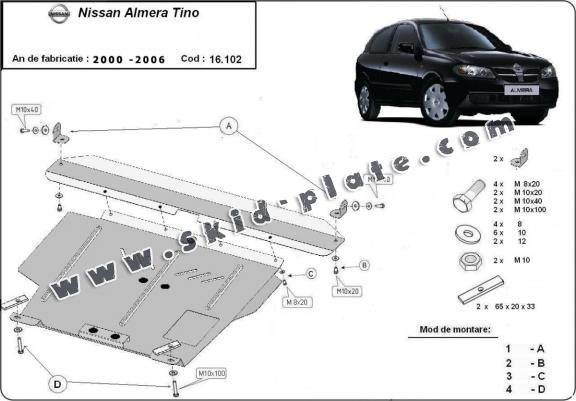 The skid plate is new and fits perfectly for the Nissan Almera Tino, with the following engine/drive versions: 1.5, 2.0 - manufactured between 2000 and 2006.