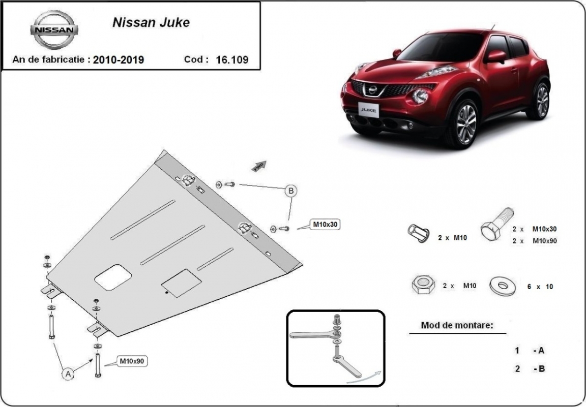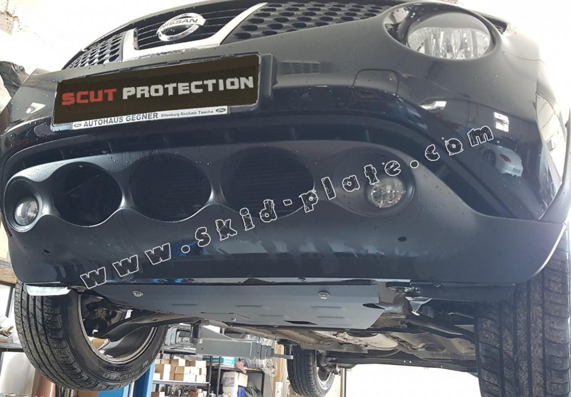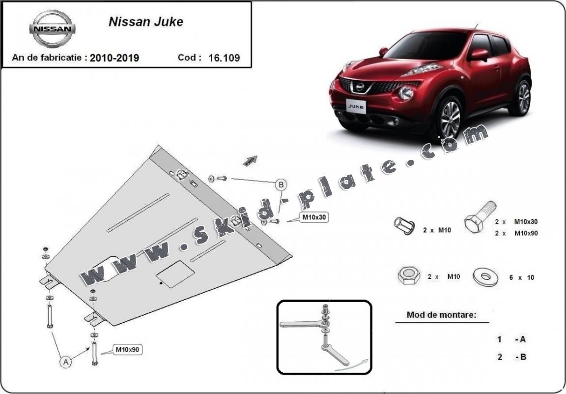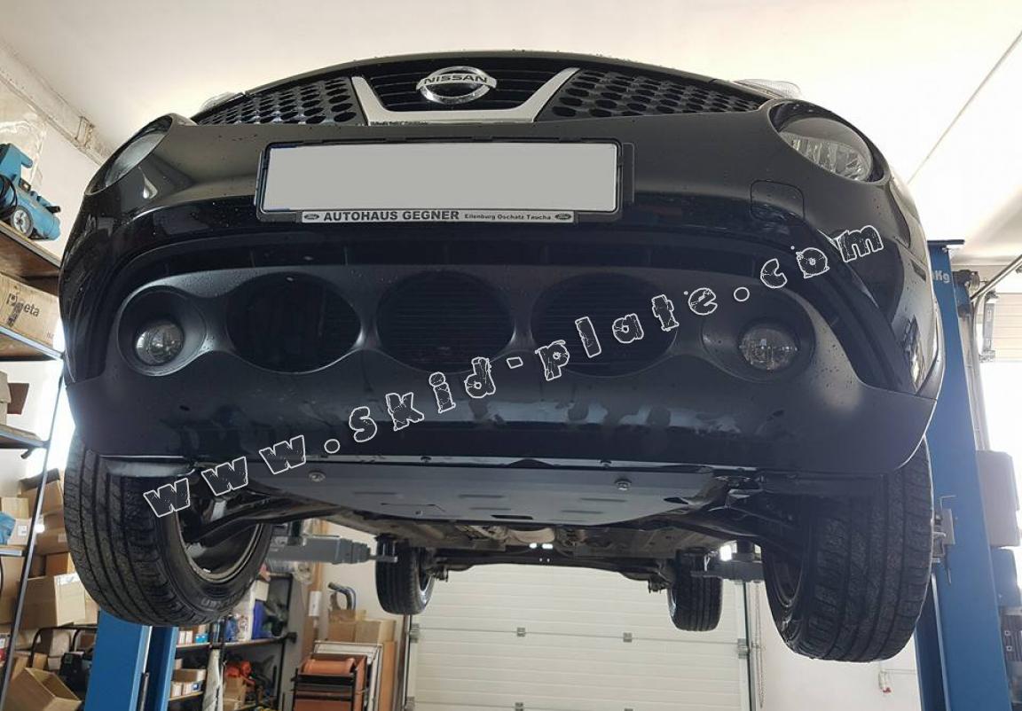 Skid plate for the protection of the: engine, gearbox, radiator The skid plate is new and fits perfectly for all versions of Nissan Juke manufactured between 2010 and 2019. It has an opening for the oil sump, so it's removal won't be necessary to change the oil. Made out of 2,5 mm thick Steel plate. Screws, nuts, clips, all fastening accessories are included. All skid plates are powder coated to prevent corrosion. The exterior of the skid plate is provided with Steel reinforcements, which increases the resistance to impact. |