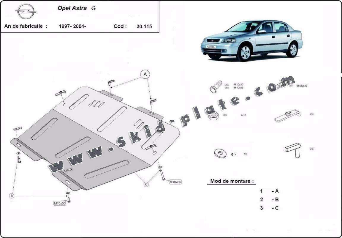 Skid plate for the protection of the: engine, gearbox, radiator The skid plate is new and fits perfectly for the Opel Astra G, with the following engine/drive versions: 1.4-2.0 - manufactured between 1997 and 2004. Made out of 2 mm thick Steel plate. Screws, nuts, clips, all fastening accessories are included. All skid plates are powder coated to prevent corrosion. The exterior of the skid plate is provided with Steel reinforcements, which increases the resistance to impact. |