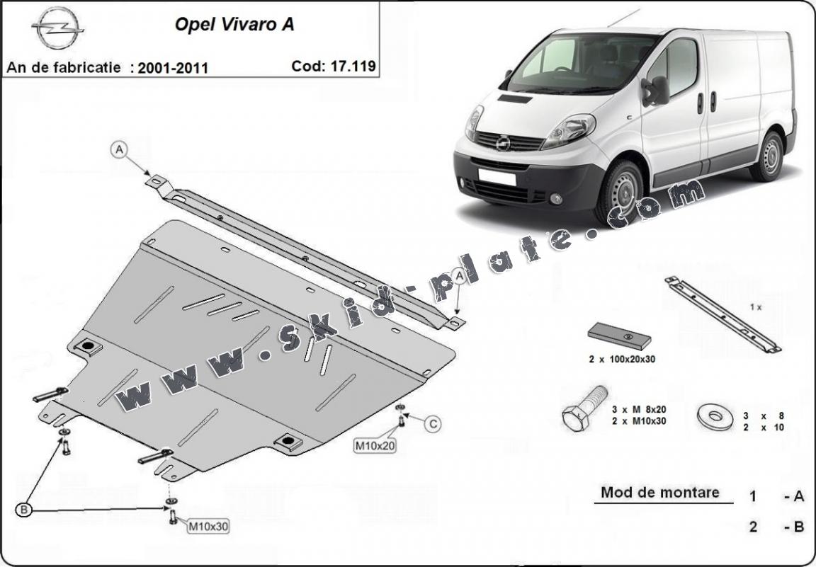 Skid plate for the protection of the: engine, gearbox, radiator The skid plate is new and fits perfectly for all versions of Opel Vivaro manufactured between 2001 and 2011. Made out of 2 mm thick Steel plate. Screws, nuts, clips, all fastening accessories are included. All skid plates are powder coated to prevent corrosion. The exterior of the skid plate is provided with Steel reinforcements, which increases the resistance to impact. |