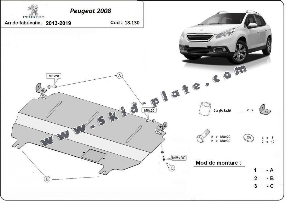 The skid plate is new and fits perfectly for all versions of Peugeot 2008 manufactured between 2013 and 2020.