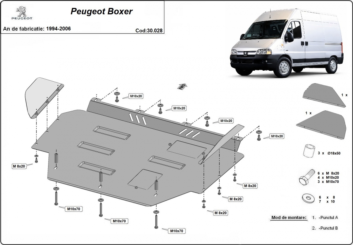 Skid plate for the protection of the: engine, gearbox, radiator The skid plate is new and fits perfectly for all versions of Peugeot Boxer manufactured between 1996 and 2006. It has an opening for the oil sump, so it's removal won't be necessary to change the oil. Made out of 2 mm thick Steel plate. Screws, nuts, clips, all fastening accessories are included. All skid plates are powder coated to prevent corrosion. The exterior of the skid plate is provided with Steel reinforcements, which increases the resistance to impact. |