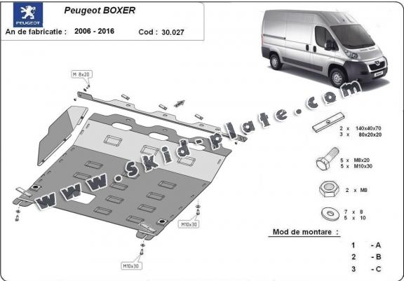 Skid plate for the protection of the: engine, gearbox The skid plate is new and fits perfectly for all versions of Peugeot Boxer manufactured between 2006 and 2016. It has an opening for the oil sump, so it's removal won't be necessary to change the oil. Made out of 2.5 mm thick Steel plate. Screws, nuts, clips, all fastening accessories are included. All skid plates are powder coated to prevent corrosion. The exterior of the skid plate is provided with Steel reinforcements, which increases the resistance to impact. |