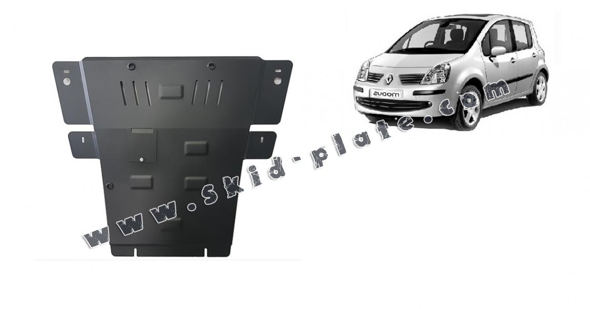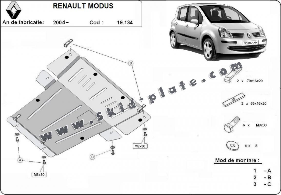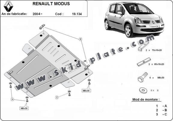 Skid plate for the protection of the: engine, gearbox, radiator The skid plate is new and fits perfectly for the Renault Modus, with the following engine/drive versions: - manufactured between 2004 and 2008. It has an opening for the oil sump, so it's removal won't be necessary to change the oil. Made out of 2 mm thick Steel plate. Screws, nuts, clips, all fastening accessories are included. All skid plates are powder coated to prevent corrosion. The exterior of the skid plate is provided with Steel reinforcements, which increases the resistance to impact. |
