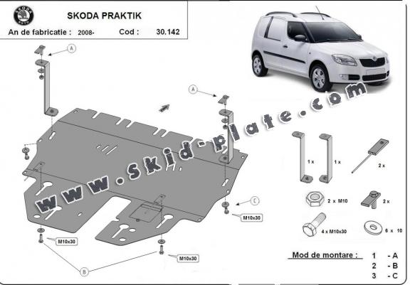 Skid plate for the protection of the: engine, gearbox, radiator, front bumper The skid plate is new and fits perfectly for all versions of Skoda Praktik manufactured between 2006 and 2015. It has an opening for the oil sump, so it's removal won't be necessary to change the oil. Made out of 2 mm thick Steel plate. Screws, nuts, clips, all fastening accessories are included. All skid plates are powder coated to prevent corrosion. The exterior of the skid plate is provided with Steel reinforcements, which increases the resistance to impact. |