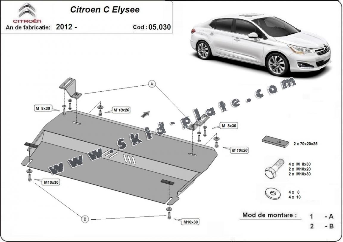 | The skid plate is new and fits perfectly for all versions of Citroen C-Elysee manufactured between 2012 and 2020. |