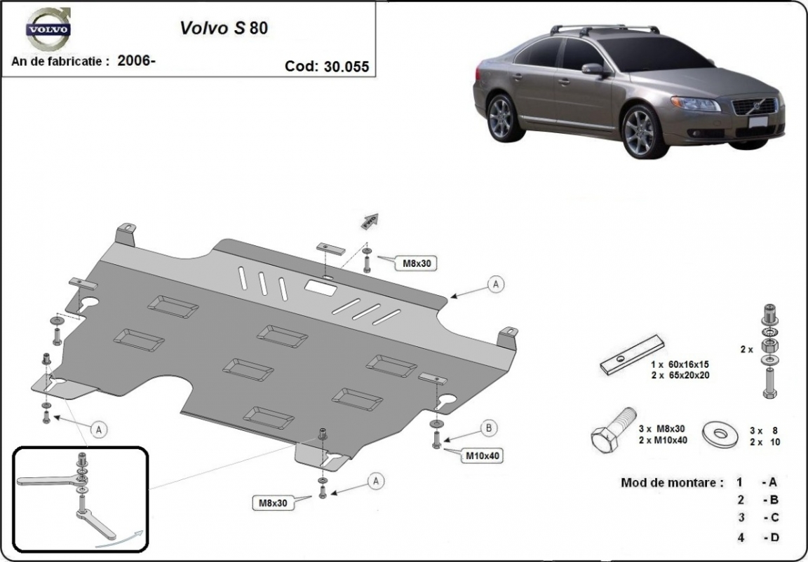 Steel skid plate for the protection of the engine and the gearbox for Volvo S80