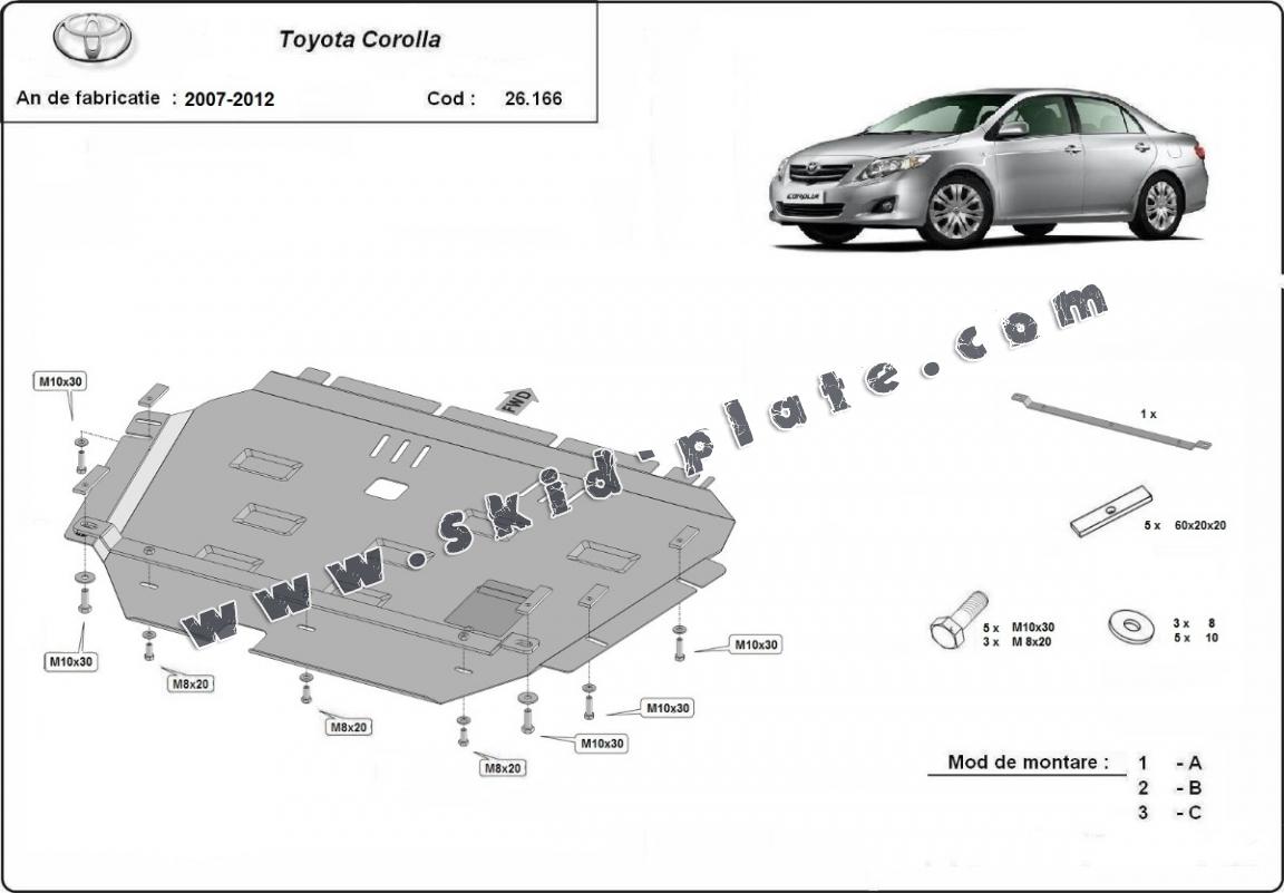 Skid plate for the protection of the: engine The skid plate is new and fits perfectly for all versions of Toyota Corolla manufactured between 2007 and 2012. It has an opening for the oil sump, so it's removal won't be necessary to change the oil. Made out of 2 mm thick Steel plate. Screws, nuts, clips, all fastening accessories are included. All skid plates are powder coated to prevent corrosion. The exterior of the skid plate is provided with Steel reinforcements, which increases the resistance to impact. |