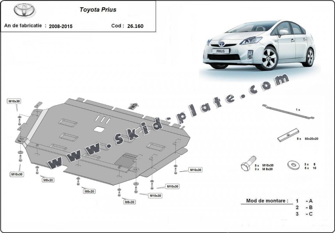 Skid plate for the protection of the: engine, gearbox The skid plate is new and fits perfectly for all versions of Toyota Prius manufactured between 2008 and 2015. It has an opening for the oil sump, so it's removal won't be necessary to change the oil. Made out of 2 mm thick Steel plate. Screws, nuts, clips, all fastening accessories are included. All skid plates are powder coated to prevent corrosion. The exterior of the skid plate is provided with Steel reinforcements, which increases the resistance to impact. |
