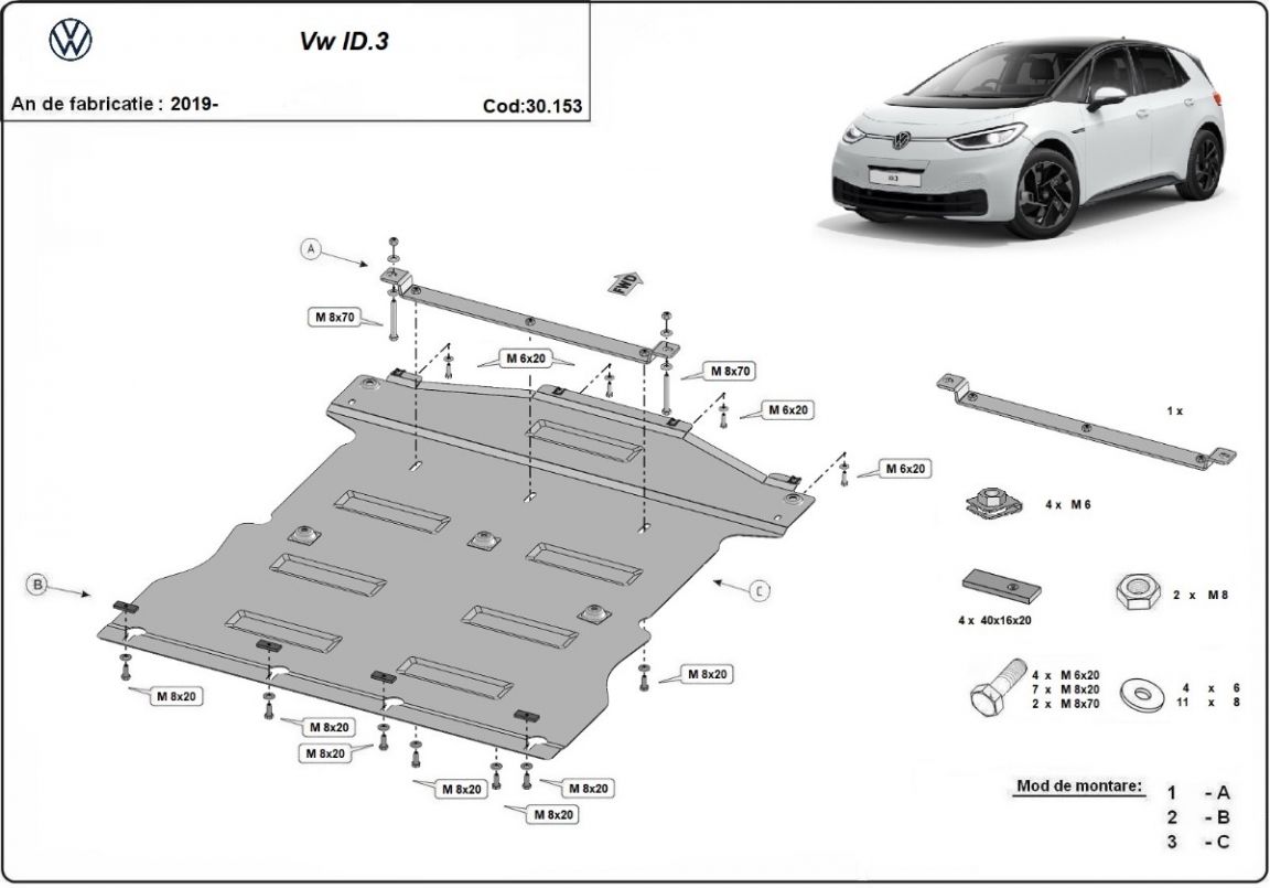 Skid plate for the protection of the: engine, gearbox, radiator The skid plate is new and fits perfectly for all versions of Volkswagen ID 3 manufactured between 2019 and 2026. Made out of 2 mm thick Steel plate. Screws, nuts, clips, all fastening accessories are included. All skid plates are powder coated to prevent corrosion. The exterior of the skid plate is provided with Steel reinforcements, which increases the resistance to impact. |