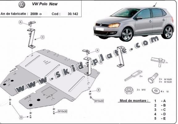 Skid plate for the protection of the: engine, gearbox, radiator, front bumper The skid plate is new and fits perfectly for the VW Polo, with the following engine/drive versions: - manufactured between 2009 and 2017. It has an opening for the oil sump, so it's removal won't be necessary to change the oil. Made out of 2 mm thick Steel plate. Screws, nuts, clips, all fastening accessories are included. All skid plates are powder coated to prevent corrosion. The exterior of the skid plate is provided with Steel reinforcements, which increases the resistance to impact. |