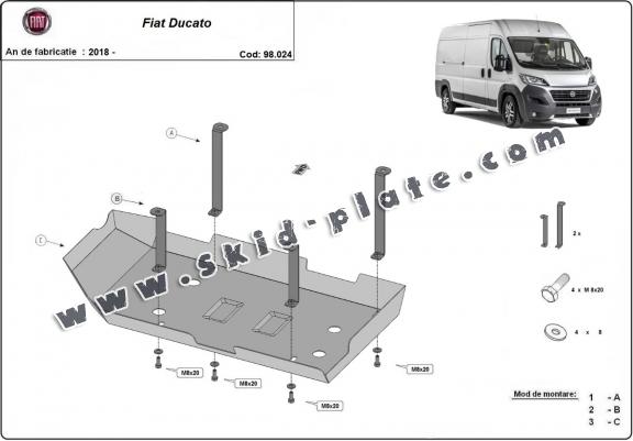 Skid plate for the protection of the: fuel tank AdBlue The skid plate is new and fits perfectly for all versions of Fiat Ducato manufactured between 2018 and 2026. Made out of 2 mm thick Steel plate. Screws, nuts, clips, all fastening accessories are included. All skid plates are powder coated to prevent corrosion. The exterior of the skid plate is provided with Steel reinforcements, which increases the resistance to impact. |