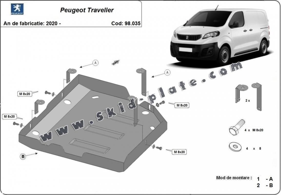 Skid plate for the protection of the: fuel tank AdBlue The skid plate is new and fits perfectly for all versions of Peugeot Traveller manufactured between 2020 and 2026. Made out of 2 mm thick Steel plate. Screws, nuts, clips, all fastening accessories are included. All skid plates are powder coated to prevent corrosion. The exterior of the skid plate is provided with Steel reinforcements, which increases the resistance to impact. |