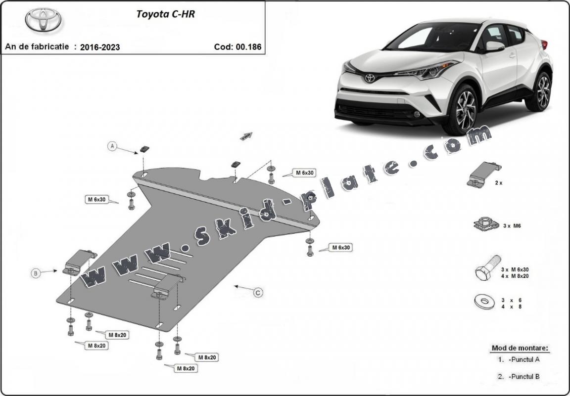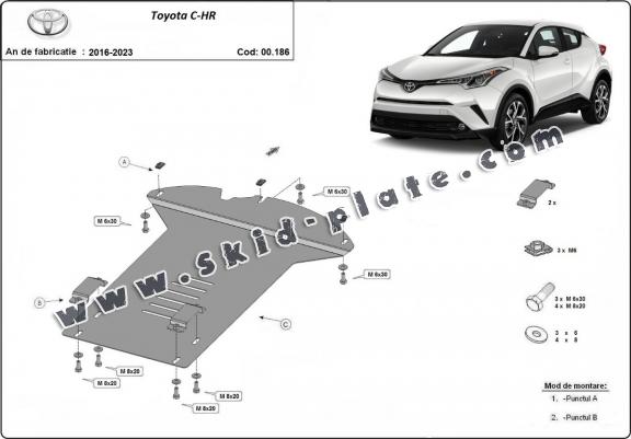Skid plate for the protection of the: Catalytic converter The skid plate is new and fits perfectly for all versions of Toyota C-HR manufactured between 2016 and 2023. Made out of 2 mm thick Steel plate. Screws, nuts, clips, all fastening accessories are included. All skid plates are powder coated to prevent corrosion. The exterior of the skid plate is provided with Steel reinforcements, which increases the resistance to impact. |