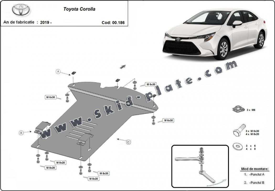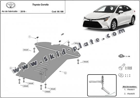 Skid plate for the protection of the: Catalytic converter The skid plate is new and fits perfectly for all versions of Toyota Corolla manufactured between 2019 and 2026. Made out of 2 mm thick Steel plate. Screws, nuts, clips, all fastening accessories are included. All skid plates are powder coated to prevent corrosion. The exterior of the skid plate is provided with Steel reinforcements, which increases the resistance to impact. |