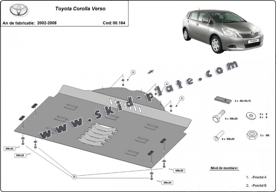 The skid plate is new and fits perfectly for all versions of Toyota Corolla Verso manufactured between 2002 and 2008.