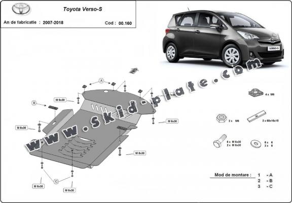 Skid plate for the protection of the: Catalytic converter The skid plate is new and fits perfectly for all versions of Toyota Verso-S manufactured between 2007 and 2018. Made out of 2 mm thick Steel plate. Screws, nuts, clips, all fastening accessories are included. All skid plates are powder coated to prevent corrosion. The exterior of the skid plate is provided with Steel reinforcements, which increases the resistance to impact. |