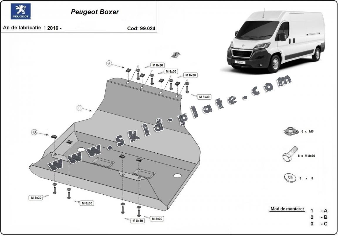 Skid plate for the protection of the: fuel tank The skid plate is new and fits perfectly for all versions of Peugeot Boxer manufactured between 2016 and 2026. Made out of 2 mm thick Steel plate. Screws, nuts, clips, all fastening accessories are included. All skid plates are powder coated to prevent corrosion. The exterior of the skid plate is provided with Steel reinforcements, which increases the resistance to impact. |