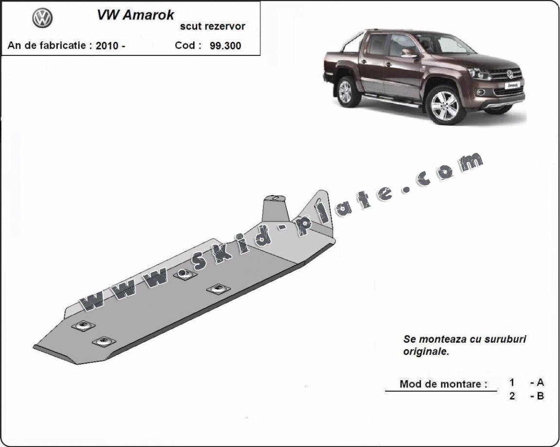 Skid plate for the protection of the: fuel tank The skid plate is new and fits perfectly for all versions of Volkswagen Amarok manufactured between 2010 and 2026. Made out of 2 mm thick Steel plate. Screws, nuts, clips, all fastening accessories are included. All skid plates are powder coated to prevent corrosion. The exterior of the skid plate is provided with Steel reinforcements, which increases the resistance to impact. |
