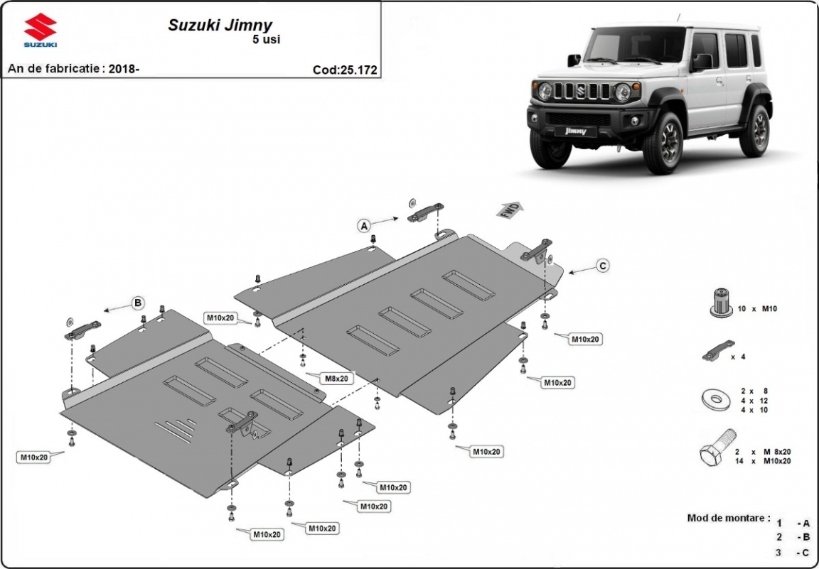Skid plate for the protection of the: gearbox, transfer case The skid plate is new and fits perfectly for all versions of Suzuki Jimny manufactured between 2018 and 2026. Made out of 2.5 mm thick Steel plate. Screws, nuts, clips, all fastening accessories are included. All skid plates are powder coated to prevent corrosion. The exterior of the skid plate is provided with Steel reinforcements, which increases the resistance to impact. |